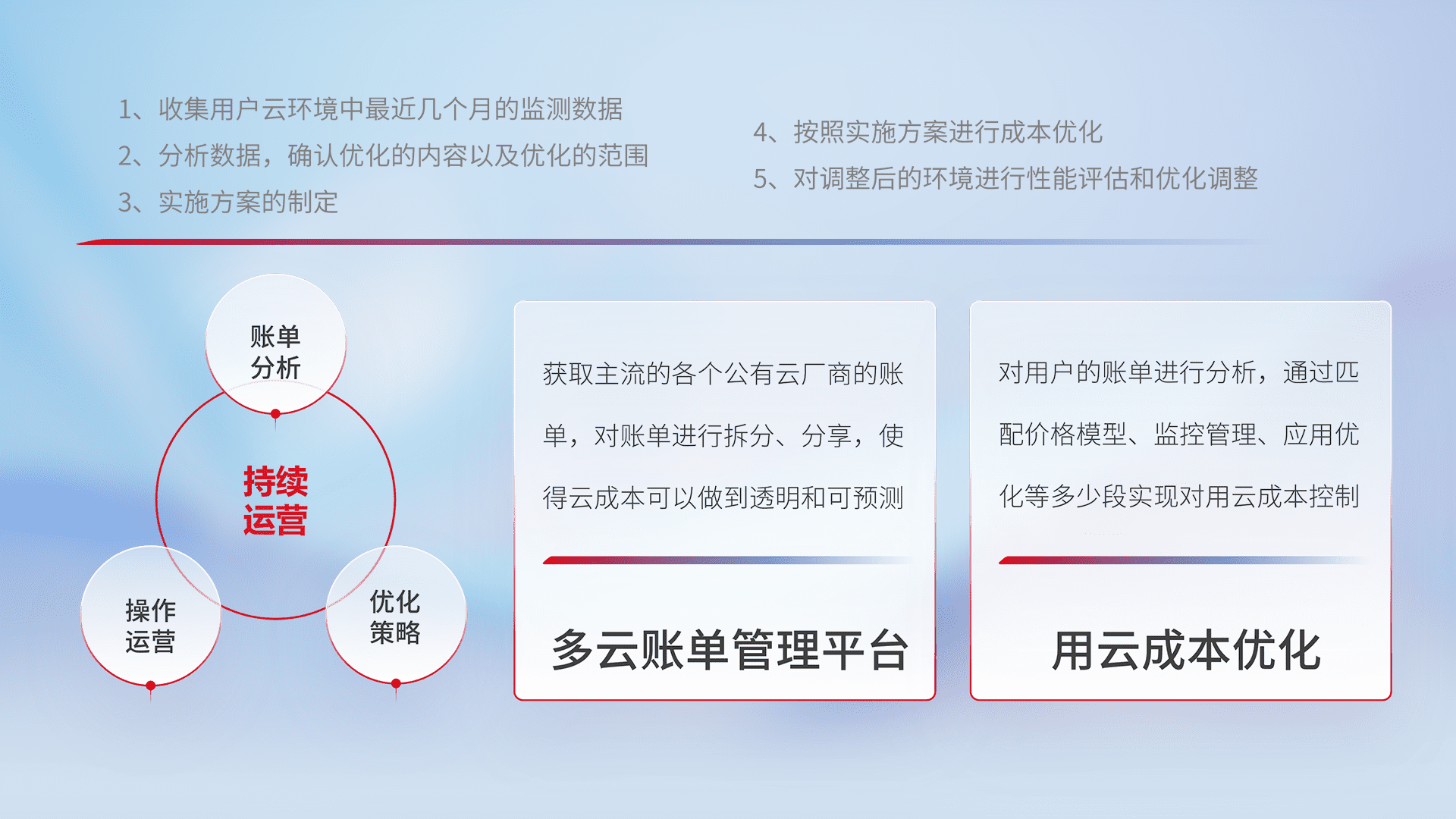通过多云纳管,,,,以统一的资源数据模型把客户的云资源进行抽象和封装,,进而实现对多云资源的统一操作,,保障云资源管理的可靠性、、、稳定性与可用性。。量身定制化运维内容,,,,配置、、开发运维、、、、补丁管理、、、、备份、、、、监控、、、认证和访问管理、、审计和日常巡检等,,保障在用云过程中的可靠度,,,,稳定度以及高可用率。。